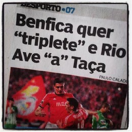 Apanhei esta há uns meses. Aqui há todo um puzzle que não leva a lado nenhum. A primeira ainda posso perceber, mas optaria por um itálico talvez. Agora aquele "a", que é aquilo? É que mesmo que imagine (impossível não o fazer) alguém a fazer aspas com os dedos, não consigo levar a sério "a" taça. Suponho que a ideia fosse destacar o valor da taça para o Rio Ave mas nesse caso usa-se um A, digo eu. E mesmo assim passava a ideia errada, eu se fosse a taça da liga amuava logo. Ou atirava a medalha ao chão. Cansa-me muito, esta coisa das aspas. Enviado de Samsung Mobile